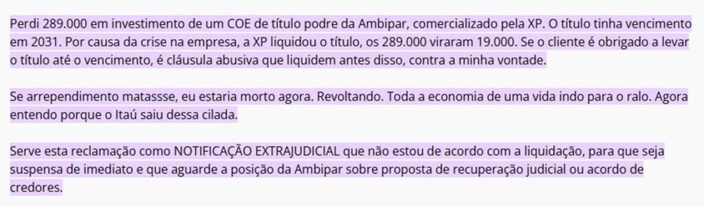 No site do Reclame Aqui, clientes que perderam dinheiro com essas operações já começam a se manifestar: