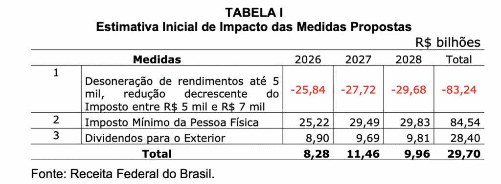 - Custo orçamentário – O projeto aponta que a renúncia fiscal estimada (R$ 25,8 bilhões em 2026) será compensada pela arrecadação do imposto mínimo sobre altas rendas e tributação de dividendos enviados ao exterior (R$ 34,12 bilhões no mesmo ano).