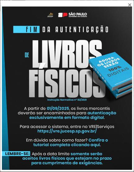Mensagem ao acessar o site da JUCESP: Fim da Autenticação de Livros Físicos