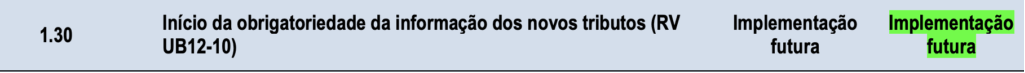O documento cita que o “início da obrigatoriedade da informação dos novos tributos (RV UB12-10)”, trazido na versão 1.30, está sujeito a “Implementação futura”, ainda sem data definida.